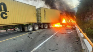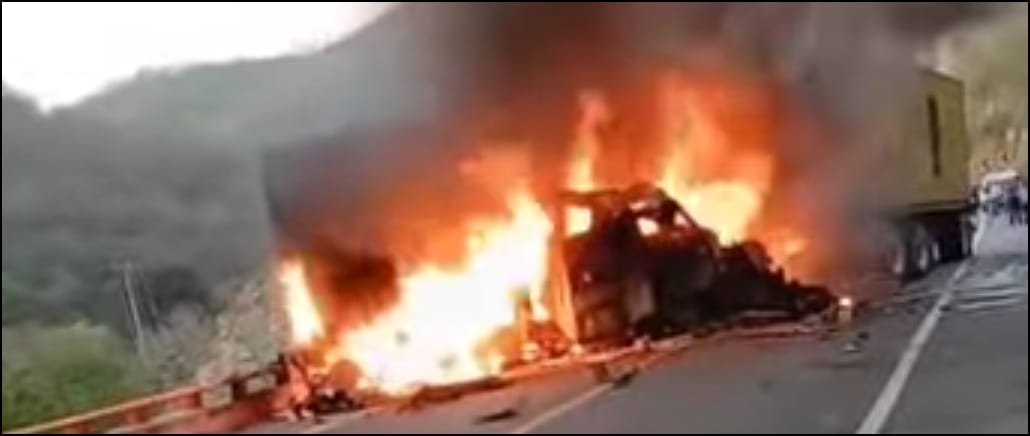 Morelia, Mich., 2 de Febrero de 2026.- Dos personas murieron y otra más resultó gravemente herida tras un aparatoso percance registrado en la autopista Siglo XXI, donde un tractocamión y una camioneta terminaron envueltos en llamas.