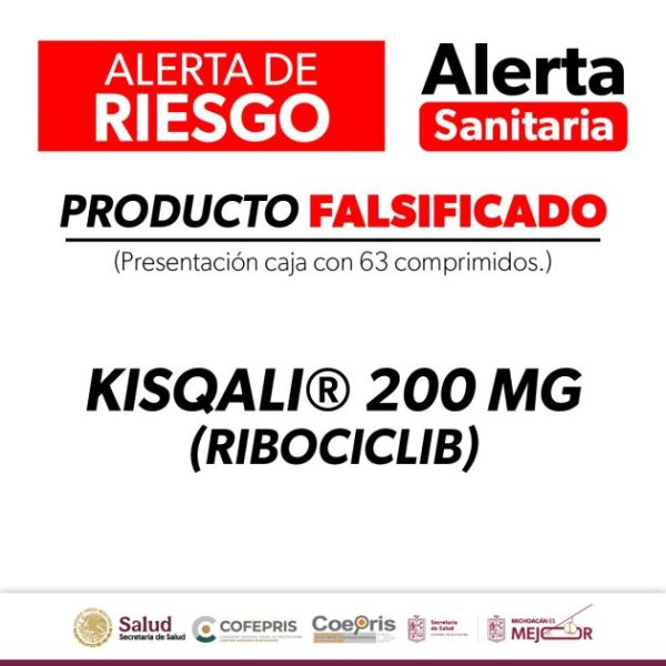 Morelia, Michoacán, 23 de marzo de 2026.-La Comisión Federal para la Protección contra Riesgos Sanitarios (Cofepris), a través de la Secretaría de Salud de Michoacán (SSM), informa a la población sobre la falsificación del medicamento KISQALI®️ (Ribociclib) 200 mg, utilizado en tratamientos oncológicos.