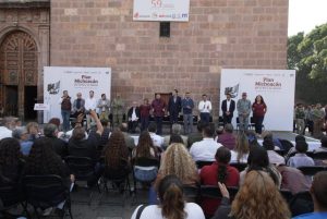 En representación del Gobierno del Estado, participaron en el presidium el secretario de Gobierno, Raúl Zepeda, y el secretario de Desarrollo Económico, Claudio Méndez Fernández, quienes refrendaron la coordinación permanente con el Gobierno de México para la implementación del plan en todo el territorio michoacano.