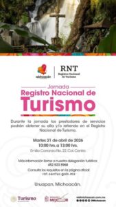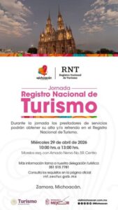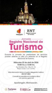 Pátzcuaro, Michoacán, 21 de abril de 2026.- La Secretaría de Turismo de Michoacán (Sectur) inició ayer con la jornada estatal 2026 del Registro Nacional de Turismo (RNT) en la región Pátzcuaro, con una positiva respuesta por parte de las y los prestadores de servicios turísticos.