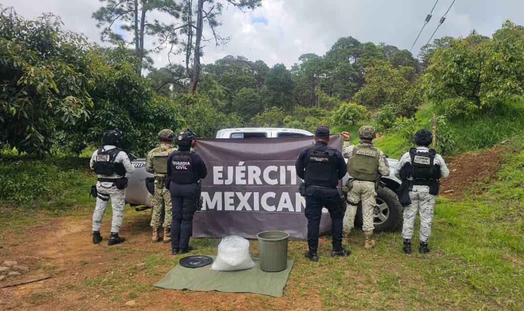 Uruapan, Michoacán, 26 de septiembre de 2025.- Este lunes elementos de las secretarías de Seguridad Pública (SSP) y de la Defensa Nacional (Defensa) encontraron al interior de un vehículo, presuntamente abandonado en una zona serrana de Uruapan, 15 kilogramos de metanfetamina.