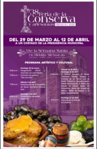 Morelia, Michoacán, 20 de marzo de 2026.- La Feria de la Conserva 2026 se realizará en Ciudad Hidalgo del 29 de marzo al 12 de abril, con la participación de más de 10 conserveros, informó la Secretaría de Turismo de Michoacán (Sectur), dependencia dirigida por Roberto Monroy García.