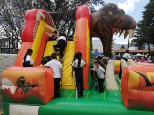 Funcionarios caracterizados como héroes, antifaces para las niñas y niños, pintacaritas, inflables, talleres de coloreado, snacks, aguinaldos, juegos, regalos y la participación del payaso Chocolatín, formaron parte de esta fiesta llena de color y entusiasmo que alegró a las familias asistentes.