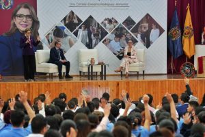 Lo anterior, al brindar la conferencia magistral “Innovación en microcredenciales y solidez académica en Ceneval”, en donde estuvo acompañada por la rectora de la Universidad Michoacana de San Nicolás de Hidalgo (UMSNH), Yarabí Ávila González.