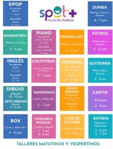 Entre las opciones disponibles se encuentran producción musical, guitarra, canto, batería, fútbol, voleibol, calistenia, patinaje, danza urbana, teatro, maquillaje, artes plásticas, vuelo de drones, talleres gastronómicos, mixología y muchas más actividades que cubren intereses musicales, deportivos, culturales, artísticos y tecnológicos.