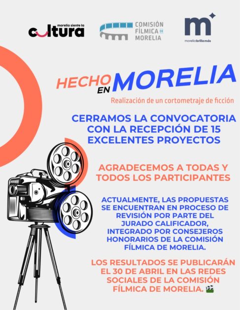 Los resultados de la convocatoria se darán a conocer el próximo 30 de abril, a través de las redes sociales oficiales de la Comisión Fílmica y de la Secretaría de Cultura de Morelia.