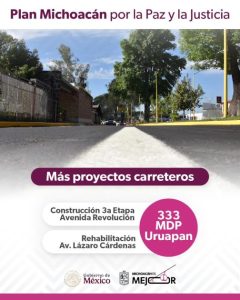 Uruapan, Michoacán, 15 de noviembre de 2025.- Dentro del Plan Michoacán por la Paz y la Justicia, que impulsa la presidenta Claudia Sheinbaum Pardo en conjunto con el Gobierno estatal, se tienen contempladas obras de infraestructura para la región Uruapan con una inversión de 333 millones de pesos.