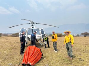 Además, como parte de las acciones, participa activamente un helicóptero con helibalde del Servicio Aéreo de la SSP, con lo que se han logrado ocho descargas de agua en más de una hora de vuelo acumulado.