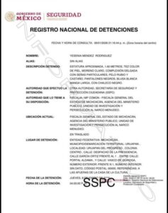 Morelia, Mich., 9 de Enero de 2026.- La Fiscalía General del Estado (FGE) de Michoacán confirmó la detención de Yesenia Méndez Rodríguez, quien se desempeñaba como secretaria particular de la alcaldesa de Uruapan, Grecia Quiroz, por su presunta relación con el homicidio de Carlos Manzo, alcalde del municipio asesinado el pasado 1 de noviembre.