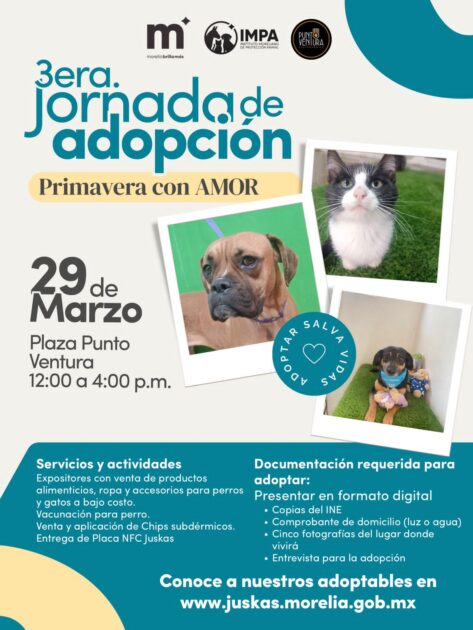 Morelia, Michoacán, a 26 de marzo de 2026.- El Gobierno de Morelia, a través del Instituto Municipal de Protección Animal (IMPA), invita a la ciudadanía a participar en la Jornada de Adopción bajo el lema “Primavera con amor”, que se llevará a cabo el próximo domingo 29 de marzo, en la Plaza Punto Ventura, ubicada en Calzada Ventura Puente 1509, colonia Electricistas, en un horario de 12:00 a 16:00 horas.