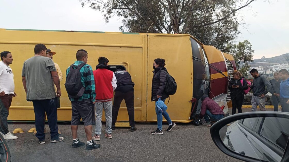 Morelia, Mich., 20 de Enero de 2026.- Un camión de transporte público ruta Hospitales, volcó en la zona de Tres Marías, frente a las oficinas de Konexo (Call Center de Liverpool).