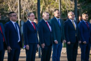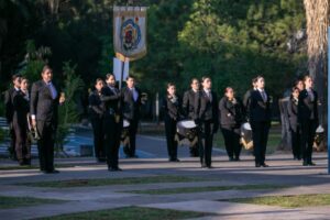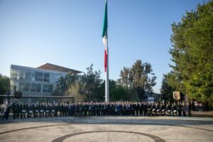 Flanqueada por integrantes del Gabinete Legal y Ampliado, la rectora nicolaita izó el lábaro patrio en la Plaza Nicolaita de Arte y Cultura, con la presencia de la Banda de Guerra, que con orgullo entonó la marcha “Crisol de Pensadoras y Pensadores”.
