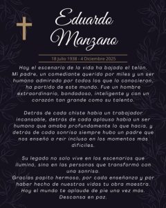 La noticia fue confirmada por su hijo, Lalo Manzano Jr., quien compartió en redes sociales una fotografía acompañada de un mensaje de despedida: