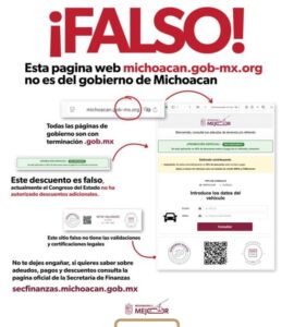 Morelia, Michoacán, 24 de enero de 2026.- Ante el incremento de páginas que en redes sociales ofrecen descuentos y promociones en refrendos, licencias de conducir y diversos trámites vehiculares, la Secretaría de Finanzas y Administración, a través del Servicio de Administración Tributaria de Michoacán (Satmich), alerta a la población para que no se víctima de engaños y fraudes.