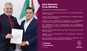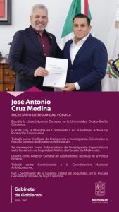 Morelia, Michoacán, 16 de noviembre de 2025.- El experto en inteligencia y seguridad, José Antonio Cruz Medina, asume la titularidad de la Secretaría de Seguridad Pública (SSP), en un relevo estratégico orientado a fortalecer la coordinación con el Gobierno federal y a consolidar la estrategia de seguridad impulsada por la presidenta Claudia Sheinbaum Pardo como parte del Plan Michoacán por la Paz y la Justicia.