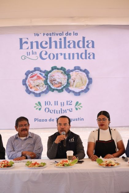 Morelia, Michoacán, a 9 de octubre de 2025.-En rueda de prensa, el Gobierno de Morelia, encabezado por el Presidente Municipal, Alfonso Martínez Alcázar, anunció la realización del 16° Festival de la Enchilada y la Corunda, que se llevará a cabo los días 10, 11 y 12 de octubre en la tradicional Plazuela de San Agustín.