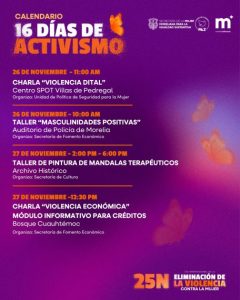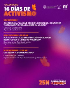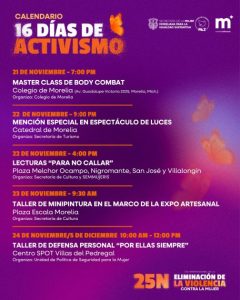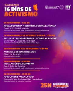 Coordinada por la Secretaría de la Mujer Moreliana para la Igualdad Sustantiva (Semmujeris) y diversas dependencias municipales, la agenda contempla actividades del 21 de noviembre al 16 de diciembre, entre talleres, conferencias, acciones de formación y ejercicios de reflexión comunitaria.