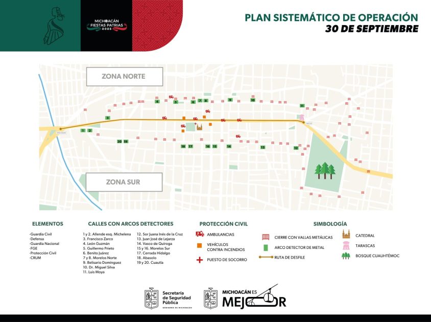 Morelia, Michoacán, 26 de septiembre de 2025.-bEn el marco del 260 Aniversario del Natalicio de José María Morelos y Pavón, la Secretaría de Seguridad Pública (SSP) establecerá un operativo integral de vigilancia, para garantizar el orden durante el desfile cívico militar del 30 de septiembre, con la habilitación de 20 puntos de acceso para el público que asista.