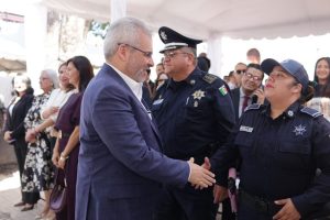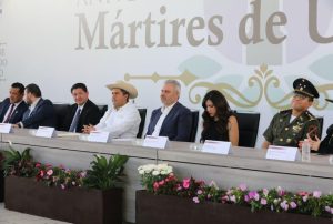 En este marco, el mandatario, acompañado de autoridades de los tres órdenes de gobierno, entregó la Presea Mártires de Uruapan a familiares del policía municipal, Vidal Brígido Guzmán, fallecido en cumplimiento de su deber; a la Secretaría de Seguridad Pública, Tránsito y Vialidad Municipal; y a los agentes locales heridos en cumplimiento de su deber, Daniela Arévalo, Yanuaria Rodríguez y Hugo Caro.