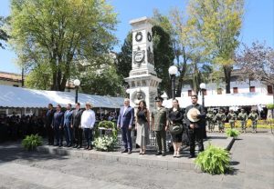 Uruapan, Michoacán, 21 de octubre de 2025.- El gobernador Alfredo Ramírez Bedolla participó en la ceremonia por el 160 Aniversario Luctuoso de los Mártires de Uruapan, con la que se honra la memoria de un grupo de militares fusilados un 21 de octubre de 1865, durante la intervención francesa.