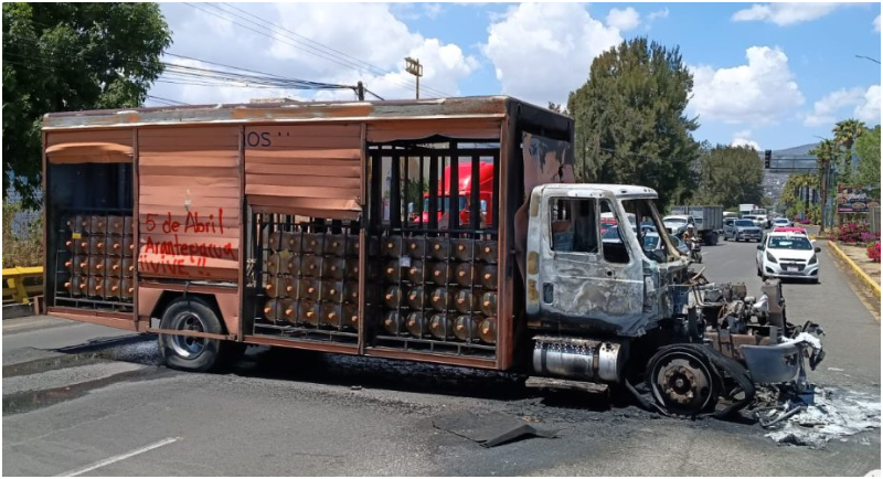Morelia, Mich.,, 6 de abril de 2027.- Integrantes de la comunidad indígena de Arantepacua incendiaron un vehículo perteneciente a una empresa de agua en las inmediaciones de la Fiscalía General del Estado, sin que se registraran detenciones.
