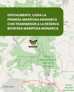 Morelia, Michoacán, 12 de noviembre de 2025.- Este fin de semana se confirmó la llegada de la primera Mariposa Monarca con transmisor a la Reserva de la Biosfera Mariposa Monarca en Michoacán. Identificada como MW026, esta viajera incansable forma parte del Proyecto Colaboración Monarca, que está revolucionando el estudio de su migración, informó la Secretaría de Turismo de Michoacán (Sectur), dependencia dirigida por Roberto Monroy García.