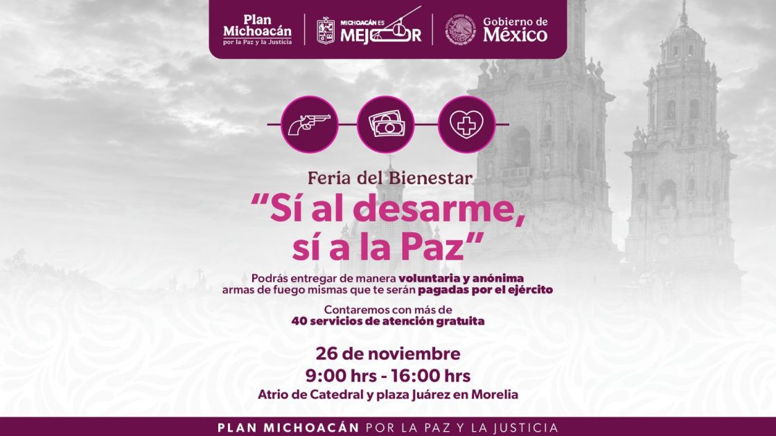 Como acción central de pacificación, se instalará el módulo de desarme voluntario “Sí al desarme, sí a la paz”, donde las personas podrán entregar armas a cambio de un apoyo económico, así como participar en el canje de juguetes bélicos por didácticos. Las autoridades llamaron a la población a asistir y aprovechar los servicios gratuitos que buscan construir paz con justicia y bienestar para Morelia y todo el estado.