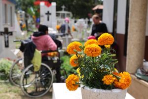 Entre música ranchera, flores cempasúchil, cubetas de agua para limpiar las lápidas y comida para disfrutar cerca del lugar de reposo del difunto, este primero de noviembre se vive un ambiente bello y familiar en el camposanto.