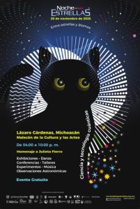 Morelia, Michoacán, 28 de noviembre de 2025.-* La Noche de las Estrellas llega por primera vez a Lázaro Cárdenas el próximo 29 de noviembre; habrá actividades en el Malecón de la Cultura y las Artes a partir de las 16:00 horas, informó la Secretaría de Turismo de Michoacán (Sectur), que dirige Roberto Monroy García.