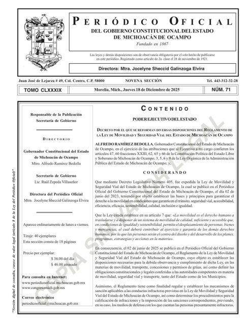 Morelia, Michoacán, 19 de diciembre de 2025.- El secretario de Gobierno, Raúl Zepeda Villaseñor, informó la publicación en el Periódico Oficial del Estado del decreto que reforma el Reglamento de la Ley de Movilidad y Seguridad Vial y elimina las multas e infracciones económicas de tránsito en Michoacán.