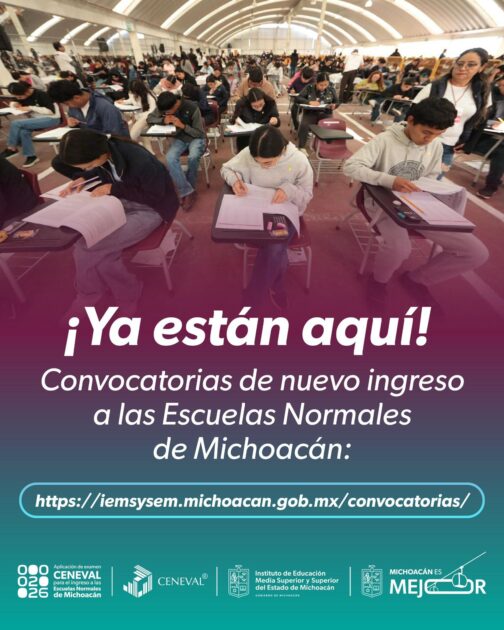 Morelia, Michoacán, 28 de abril de 2026.- El Instituto de Educación Media Superior y Superior del Estado (Iemsysem) informa que ya están abiertas las convocatorias para ingresar a las ocho Escuelas Normales Oficiales y al Centro de Actualización del Magisterio en Michoacán (CAMM), manteniéndose una oferta de mil 80 espacios disponibles.