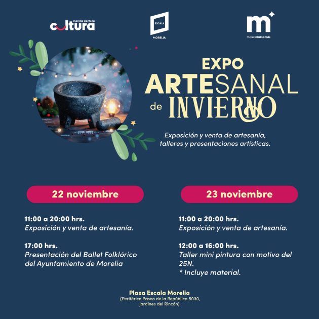 Morelia, Michoacán; 18 de noviembre de 2025.- Con el objetivo de promover la cultura y el talento artesanal local, el Gobierno de Morelia encabezado por el presidente municipal, Alfonso Martínez Alcázar, invita a la ciudadanía a disfrutar de la Expo Artesanal de Invierno, este 22 y 23 de noviembre en la Plaza Escala Morelia.