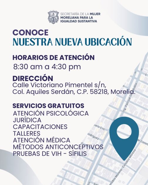 Morelia, Michoacán, 12 de enero de 2026.- Con el propósito de acercar servicios de atención integral, fortalecer el acompañamiento y garantizar espacios seguros para las mujeres, la Secretaría de la Mujer Moreliana para la Igualdad Sustantiva (Semmujeris), del Gobierno de Morelia, que encabeza el presidente municipal Alfonso Martínez Alcázar, informa a la ciudadanía que se encuentra lista para recibir a quienes requieran atención y orientación en sus nuevas instalaciones.