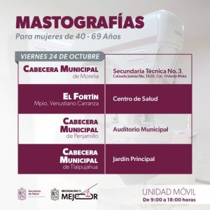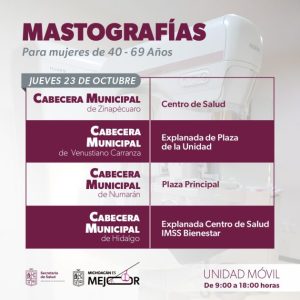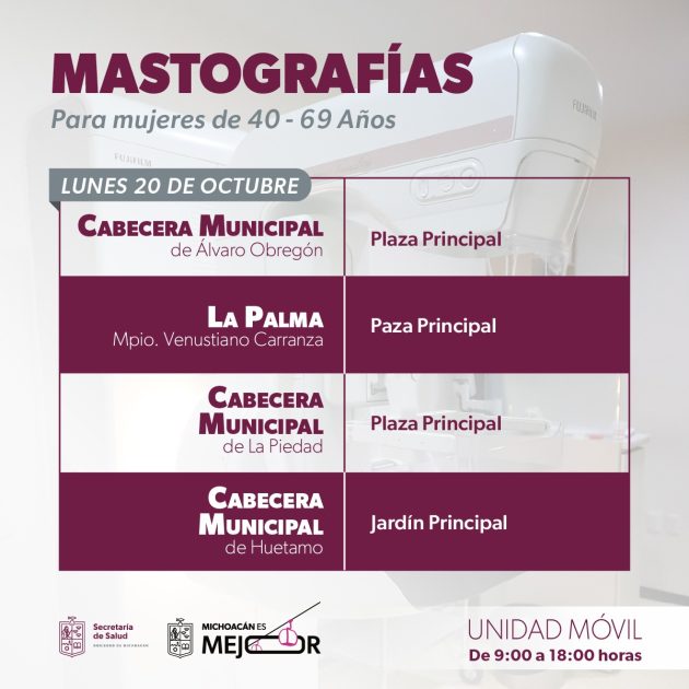 Morelia, Michoacán, 20 de octubre de 2025.- La Secretaría de Salud de Michoacán (SSM) continúa con el despliegue de unidades móviles de mastografía para la detección oportuna del cáncer de mama en mujeres de 40 a 69 años de edad, del 20 al 24 de octubre estarán en 11 municipios de la entidad.