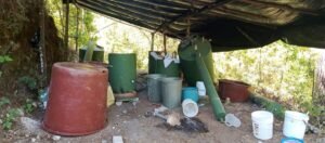 En el sitio se aseguraron 17 tambos con precursores químicos como alcohol desnaturalizado, hipoclorito y macropol; además de ocho tanques de gas LP, seis reactores y diversos costales de sosa cáustica. Tras el inventario y aseguramiento de los materiales, se procedió a incinerar el lugar.