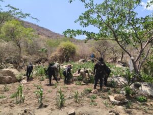 Huetamo, Michoacán, 22 de abril de 2026.- Como parte del reforzamiento de las acciones operativas en la región Tierra Caliente, elementos de la Secretaría de Seguridad Pública (SSP) y de la Defensa Nacional (Defensa) localizaron y destruyeron un plantío con 14 mil 400 plantas de marihuana en la zona serrana del municipio de Huetamo.