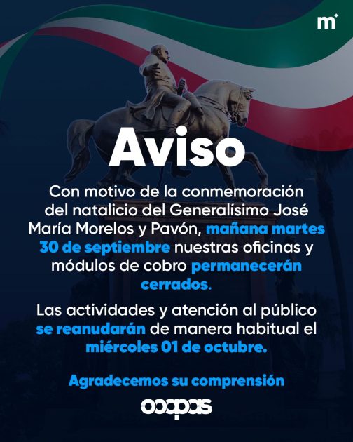 Morelia, Michoacán, septiembre de 2025.– El Organismo Operador de Agua Potable, Alcantarillado y Saneamiento de Morelia (Ooapas) informa a las y los usuarios que el próximo martes 30 de septiembre se suspenderán labores en oficinas centrales y módulos de cobro, con motivo de la conmemoración del natalicio del Generalísimo José María Morelos y Pavón.