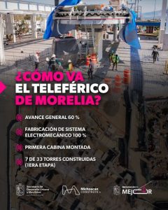 Morelia, Michoacán, 8 de diciembre de 2025.- La construcción del teleférico de Morelia avanza en un 60 por ciento, con un sistema electromecánico fabricado en un 98 por ciento y un avance promedio por estación superior al 50 por ciento, informó la secretaria de Desarrollo Urbano y Movilidad, Gladyz Butanda Macías.