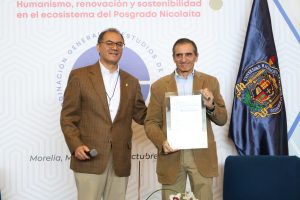 Morelia, Michoacán, a 10 de octubre de 2025.- El doctor Omar Masera Cerutti, Premio Nóbel de la Paz 2007 y actual investigador del Instituto de Investigaciones en Ecosistemas y Sustentabilidad de la Universidad Autónoma de México (UNAM) visitó la Universidad Michoacana de San Nicolás de Hidalgo (UMSNH) para compartir su invaluable experiencia con la comunidad estudiantil y docente, quien fue recibido por la rectora Yarabí Ávila González.